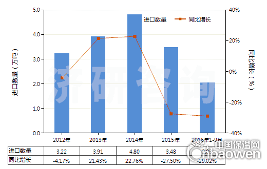 图 2012-2016年9月中国未膨胀的珍珠岩(HS25301020)进口量及增速统计