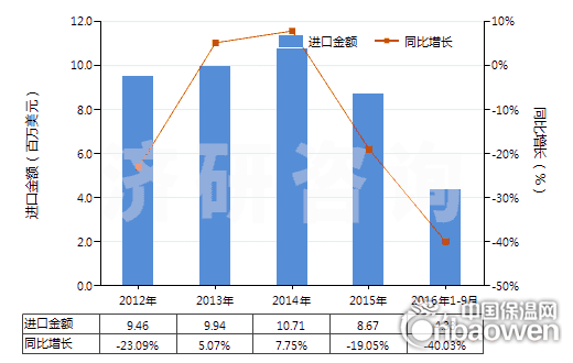 图 2012-2016年9月中国未膨胀的珍珠岩(HS25301020)进口总额及增速统计
