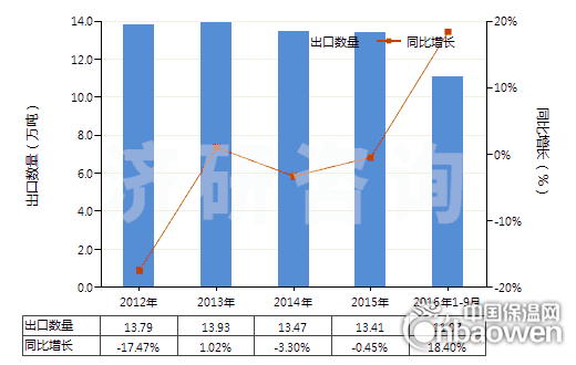从出口量方面来看,济研咨询数据显示,2016年1-9月我国未膨胀的珍珠岩出口量达11.07万吨,与上年同期相比增长了18.40%。2015年我国未膨胀的珍珠岩出口数量为13.41万吨,与上年同期相比下降了0.45%。详见下图: