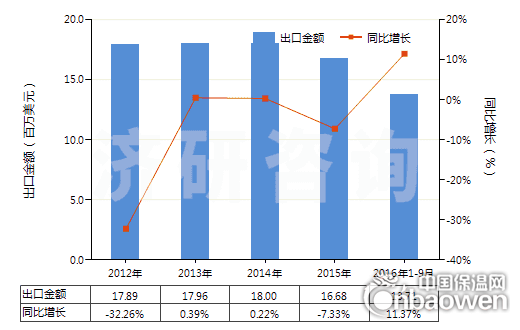 从出口额方面来看,济研咨询数据显示,2016年1-9月我国未膨胀的珍珠岩出口金额为13.71百万美元,与上年同期相比增长了11.37%。2015年我国未膨胀的珍珠岩出口金额为16.68百万美元,与上年同期相比下降了7.33%。详见下图:
